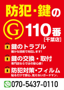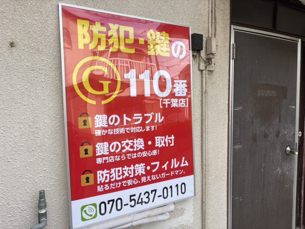 防犯・鍵のG110番 千葉店 店名防犯・鍵のG110番 千葉店 郵便番号〒276-0031 住所 千葉県八千代市八千代台北16-1-4 1号棟 電話番号070-5437-0110 千葉県全域対応!安心・迅速・信頼の鍵サービス お困りの際はすぐにお電話ください 私たちが提供するサービス 緊急鍵開け 万が一、家や車に閉め出されてしまってもご安心ください。私たちは迅速に対応し、平均30分以内に現場へ到着いたします。鍵のトラブルをスピーディに解決し、お客様に安心をお届けします。 鍵交換 古い鍵を最新の安全な鍵に交換し、安心を強化します。防犯性能の高い製品を多数取り揃えており、お客様のニーズに合わせた最適な鍵をご提案いたします。 鍵修理 壊れた鍵や動きの悪い鍵もお任せください。可能な限りその場で修理を行い、スムーズな動作を取り戻します。 サービス提供エリア 千葉県全54市町村に対応しています。主な地域: 千葉市(中央区、花見川区、稲毛区、若葉区、緑区、美浜区) 船橋市 松戸市 市川市 柏市 市原市 浦安市 習志野市 流山市 八千代市 我孫子市 成田市 佐倉市 野田市 鎌ケ谷市 印西市 白井市 四街道市 袖ケ浦市 八街市 その他の町村すべて どこにお住まいでも、同一料金で迅速に対応いたします! サービスの流れ STEP01 お電話でのお問い合わせ 鍵のトラブルが発生した際は、まずはお気軽にお電話ください。専門スタッフが迅速に対応し、状況を丁寧にお伺いします。 STEP02 ご訪問・現地調査 ご指定の場所にスタッフが訪問し、鍵の状態を確認します。問題の箇所を調査し、最適な解決方法をご提案します。 STEP03 お見積もり提示 現地での調査結果をもとに、作業にかかる費用をその場でお見積もりいたします。ご納得いただけた場合、すぐに作業を開始します。 STEP04 作業完了・ご確認 作業完了後、お客様に最終確認をしていただきます。問題が解決されたことを確認した上で、お支払いとなります。 よくある質問(FAQ) Q1: 千葉県のどの地域でも対応可能ですか? A1: はい、千葉市内はもちろん、船橋市、松戸市など千葉県全54市町村に対応しています。県内であればどこでも同一料金で迅速にサービスを提供いたします。 Q2: 夜間や休日の対応は可能ですか? A2: 対応しております。夜間や休日でも追加料金なしで駆けつけます。 Q3: 料金はどのように決まりますか? A3: 基本料金に作業内容に応じた料金が加算されます。千葉県内であれば、場所による追加料金はありません。 Q4: どのくらいの時間で到着しますか? A4: 通常、お電話いただいてから45分以内に現場に到着いたします。 Q5: 鍵の種類によって対応できない場合はありますか? A5: 基本的にはすべての種類の鍵に対応しております。特殊な鍵の場合は、お電話の際にその旨をお伝えください。 Q6: 身分証明書は必要ですか? A6: はい、防犯上の理由から、作業前にご本人確認をさせていただきます。顔写真付きの身分証明書(運転免許証、パスポートなど)をご用意ください。 Q7: 支払方法は何がありますか? A7: 現金、クレジットカード、電子マネーでのお支払いに対応しています。各種クレジットカード(VISA、MasterCard、JCB、American Express)がご利用いただけます。 お問い合わせフォーム お問い合わせ項目 ご質問・ご相談お見積もり依頼その他のお問い合わせ お名前 電話番号 メールアドレス お問い合わせ内容